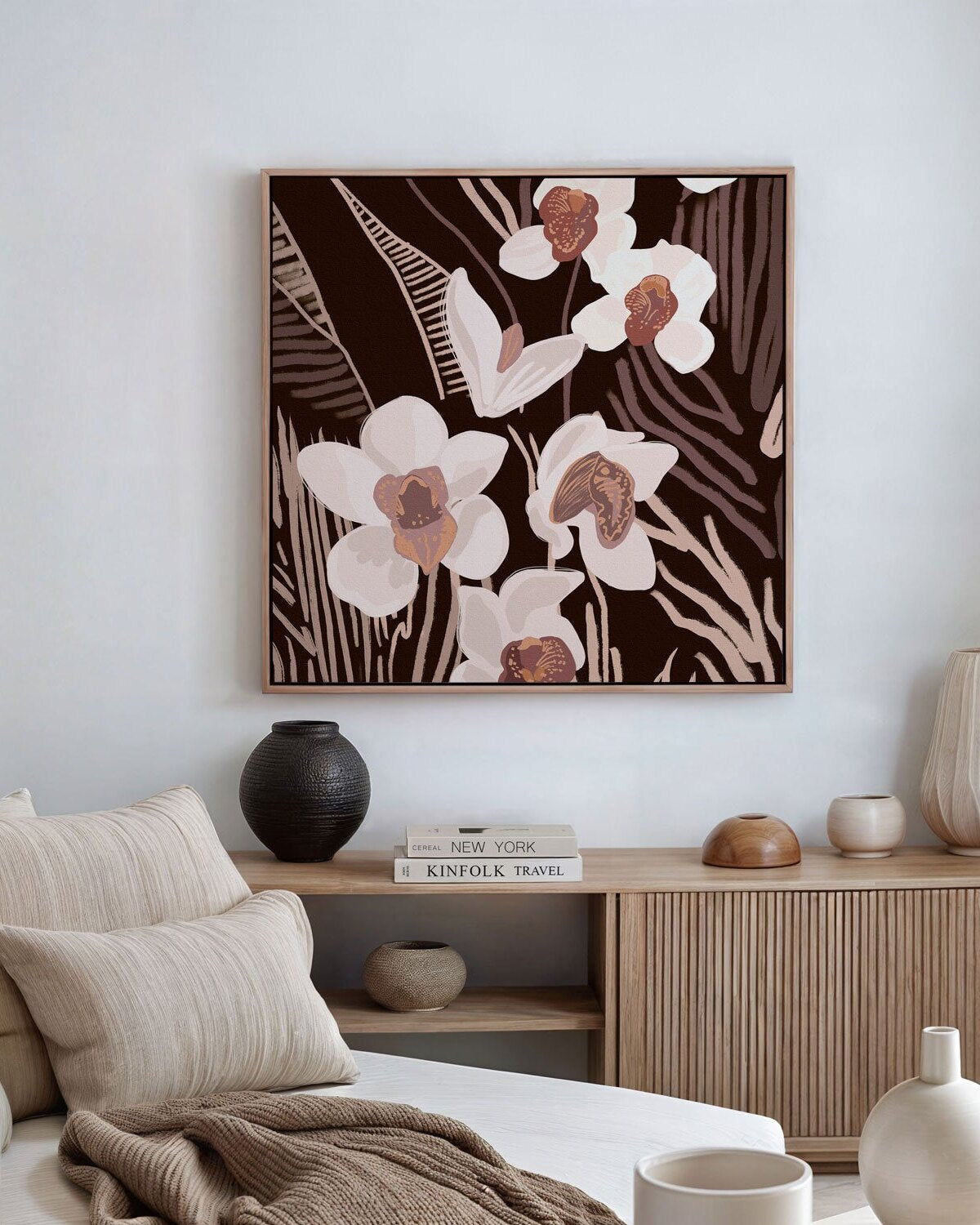 Each piece arrives at your doorstep fully framed and ready to hang. We use a floating frame that creates space between the canvas and the edge. The frame adds an extra 5cm to the overall height and width.