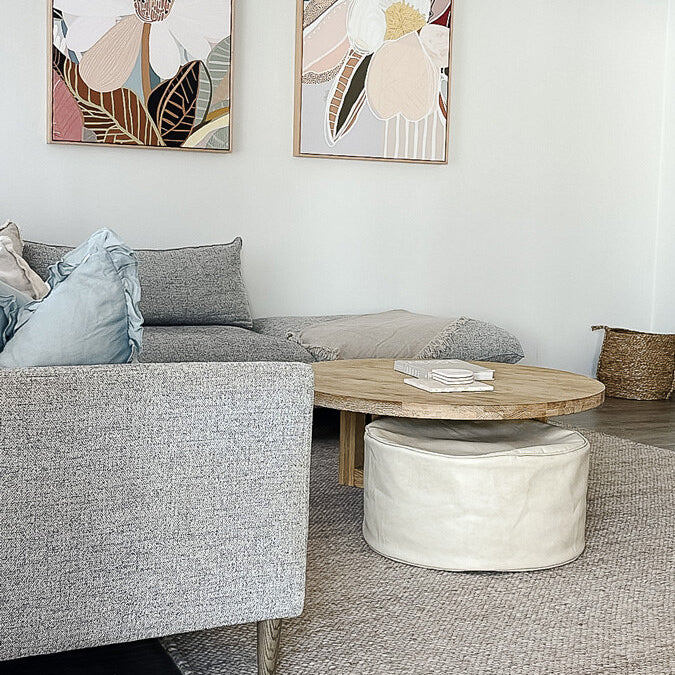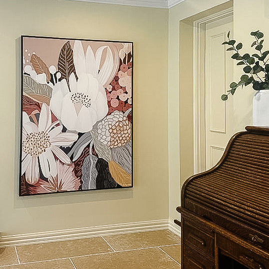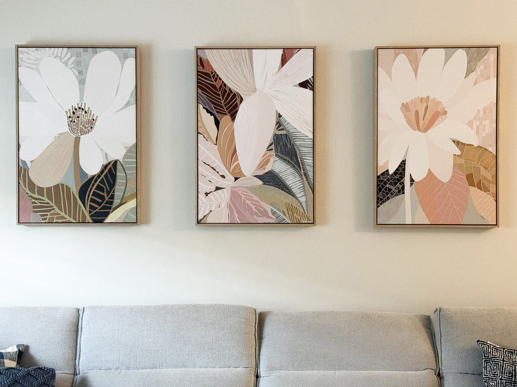 Each piece arrives at your doorstep fully framed and ready to hang. We use a floating frame that creates space between the canvas and the edge. The frame adds an extra 5cm to the overall height and width.