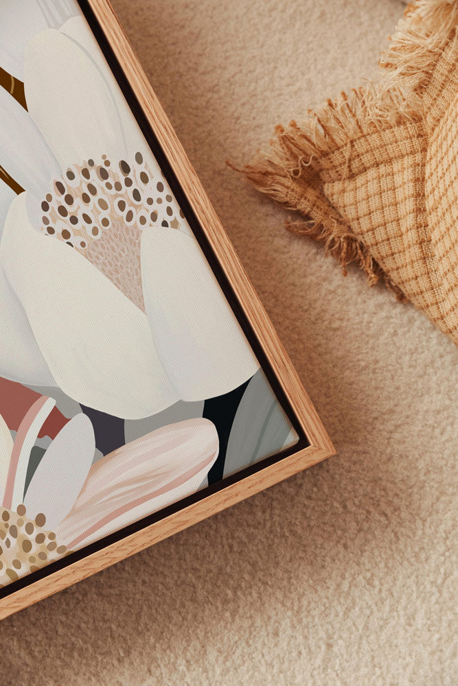 Each piece arrives at your doorstep fully framed and ready to hang. We use a floating frame that creates space between the canvas and the edge. The frame adds an extra 5cm to the overall height and width.